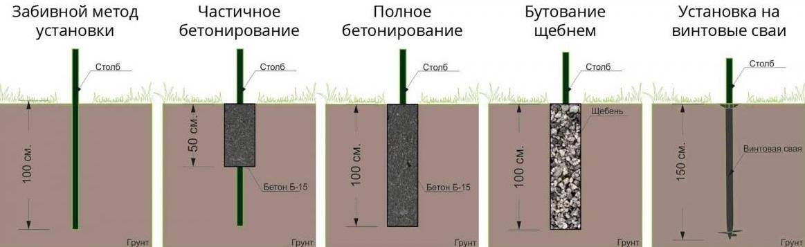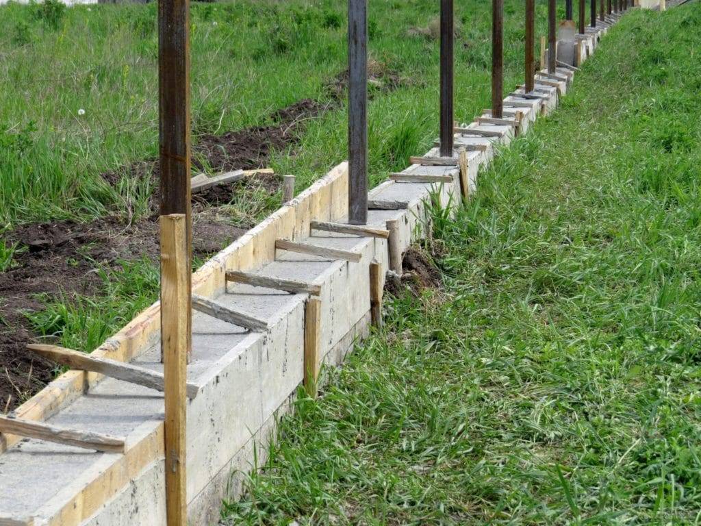 Важно! Перед постройкой фундамента надо понимать, под какой забор фундамент годится. Для кирпичного забора с коваными конструкциями подойдёт крепкий ленточный, монолитный или комбинированный свайно-ленточный, а для лёгкого ограждения из сетки-рабица достаточно и столбового