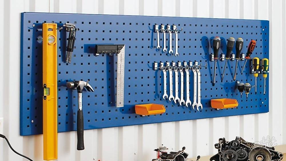 На доски, лист ДСП, фанеры, набить гвоздей под каждый инструмент. Чтобы не путаться куда что повесить — обвести инструмент на месте и закрасить каким-то цветом.