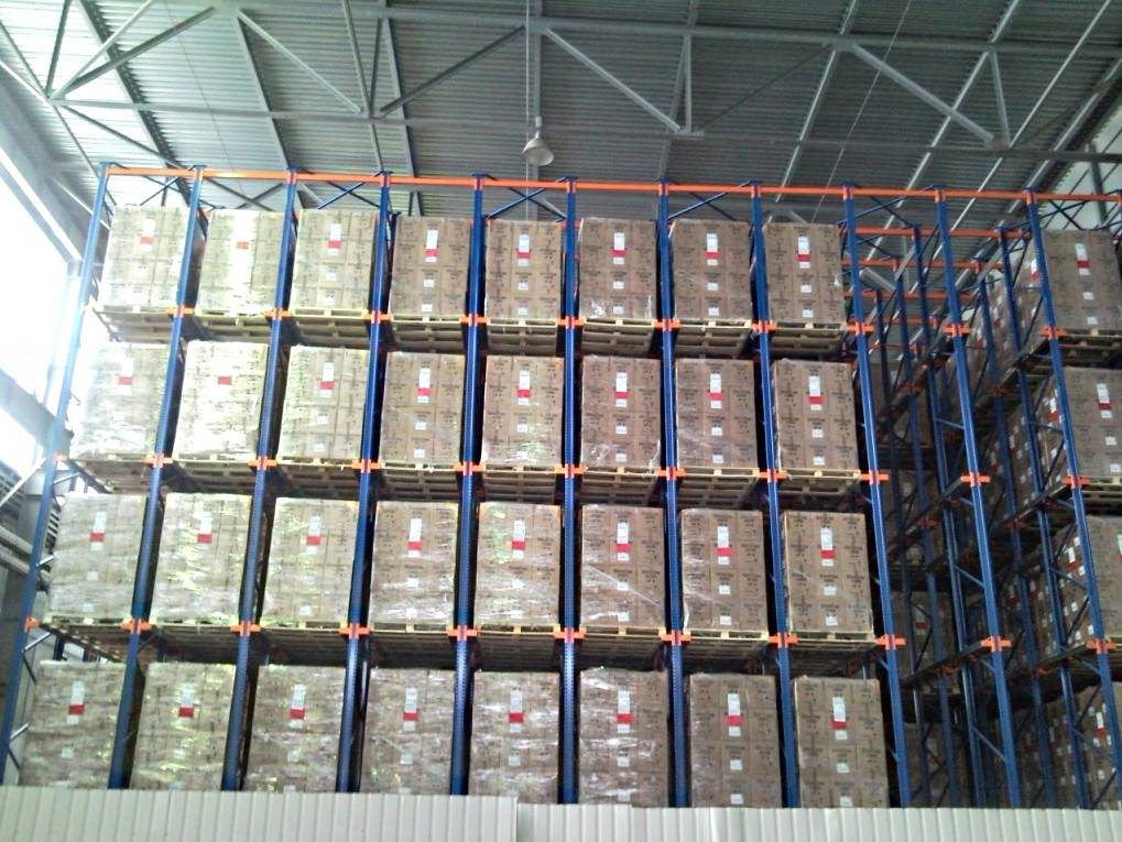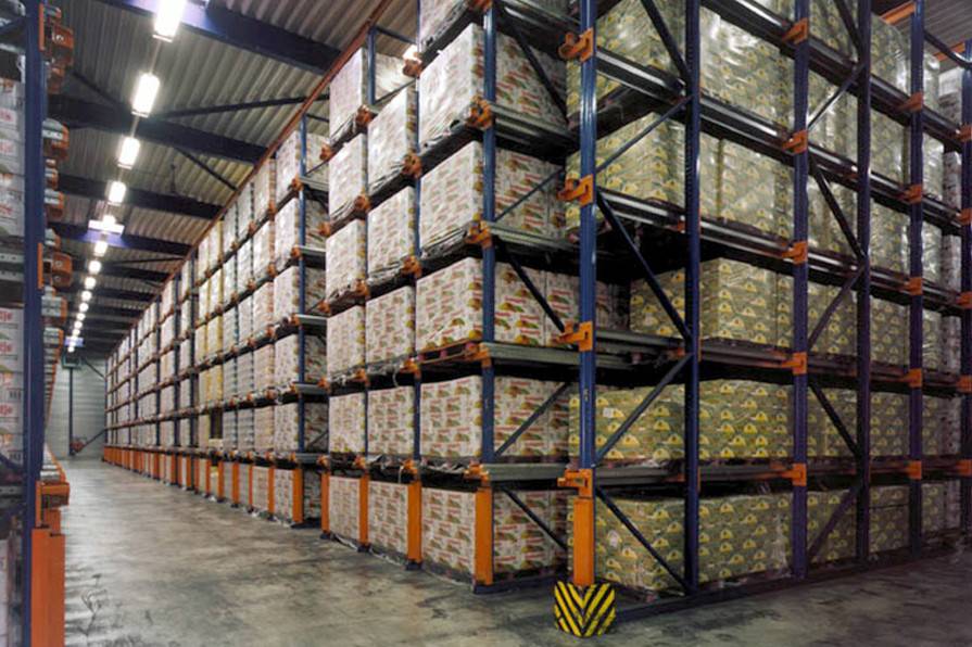 В данных стеллажах нет прямого доступа к каждому поддону, но достигается высокая плотность хранения из-за того, что уменьшается число проездов между блоками. Загружают и выгружают паллеты с помощью въезда погрузчика вовнутрь канала системы.