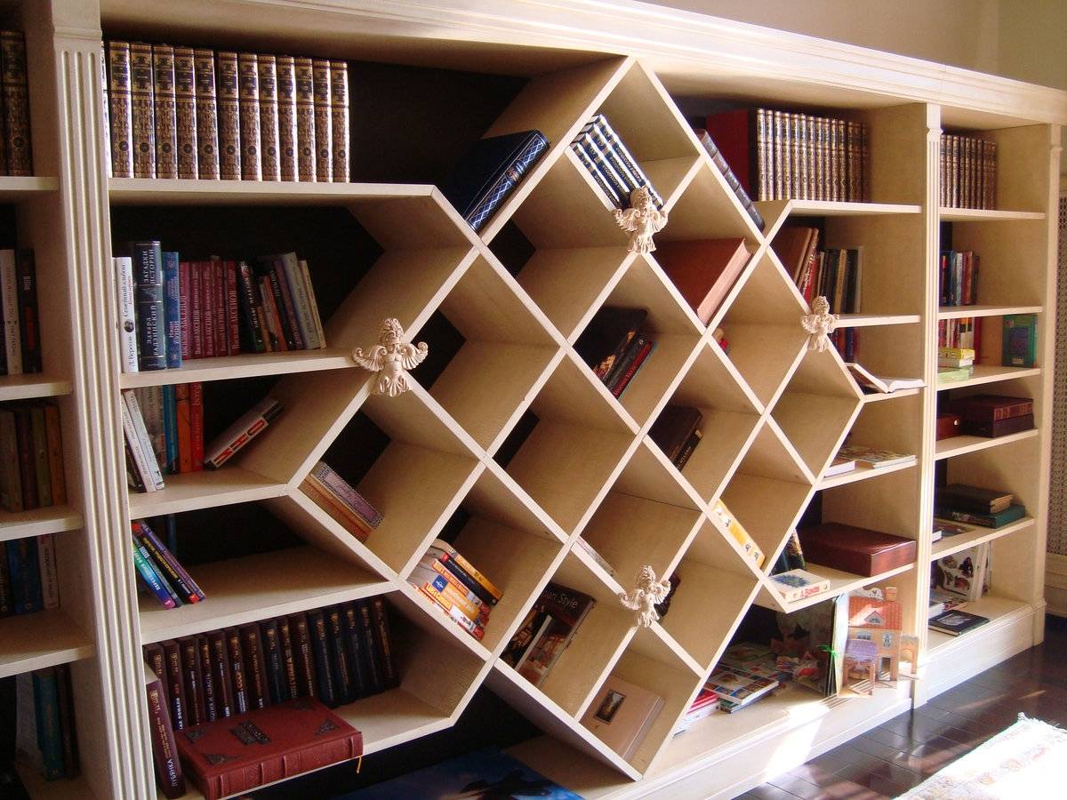 Стеллаж, полки которого расположены по диагонали, выглядит гораздо интереснее и креативнее классического.