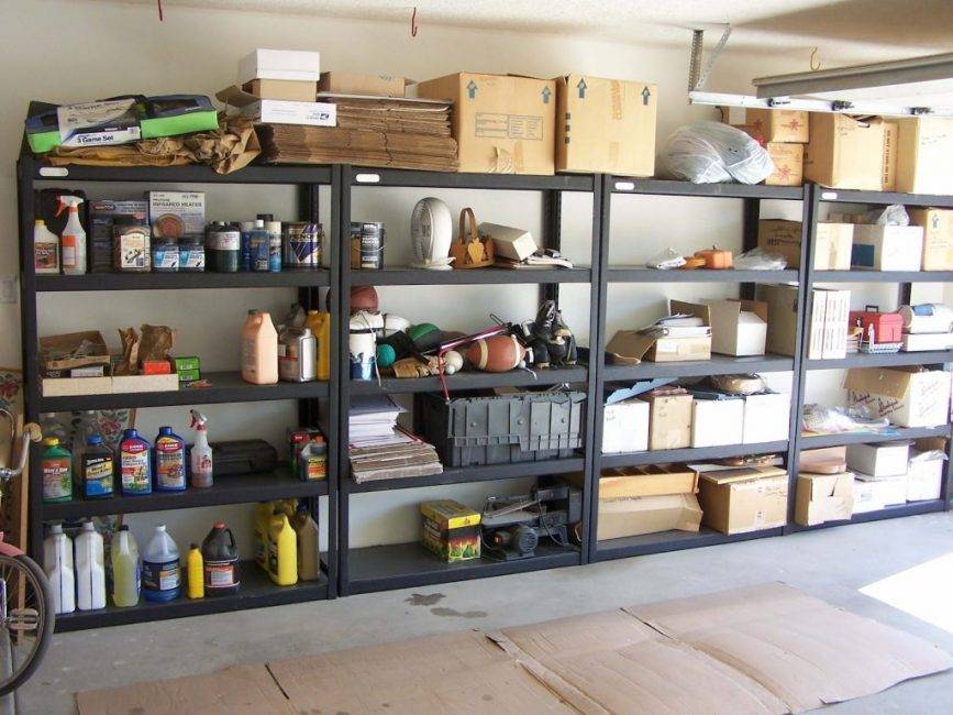 Если на полки будут устанавливаться емкости с жидкостями, по низу лучше предусмотреть небольшие бортики. Обязательно продумайте, где вы будете хранить массивные вещи. Такие полки должны быть дополнительно укреплены. Иначе со временем они провиснут, а затем и вовсе обвалятся. Зимнюю и летнюю резину лучше подвесить ближе к потолку, чтобы она занимала минимум свободного места.