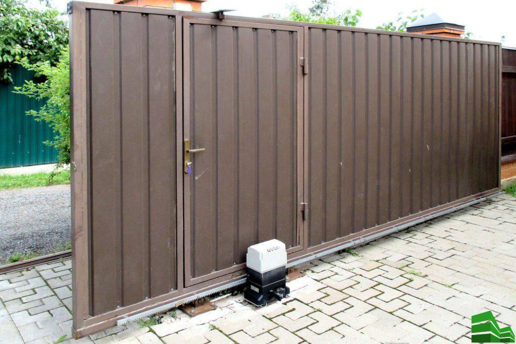 - Встроенная калитка тяжелая. Иногда это становится причиной провисания полотна, уменьшения жесткости и ослабления опорного каркаса. Следует постараться, чтобы минимизировать такие риски. Для этого достаточно установить калитку неподалеку от роликового механизма или петель.