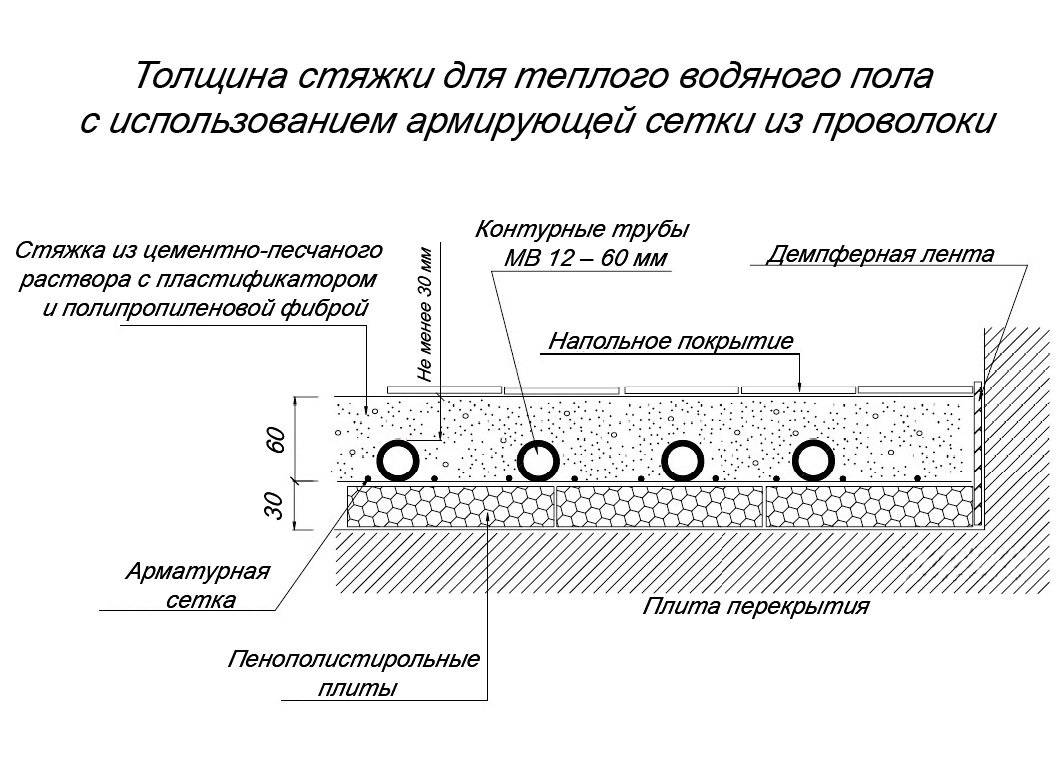 - если пол водяной, то ее поверхность должна возвышаться над трубами на 30 – 150 мм. Оптимальная же толщина стяжки для этой разновидности теплого пола составляет 100 мм;
