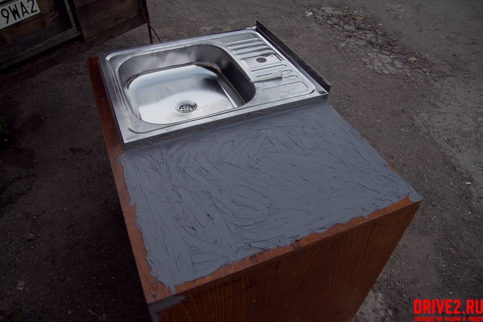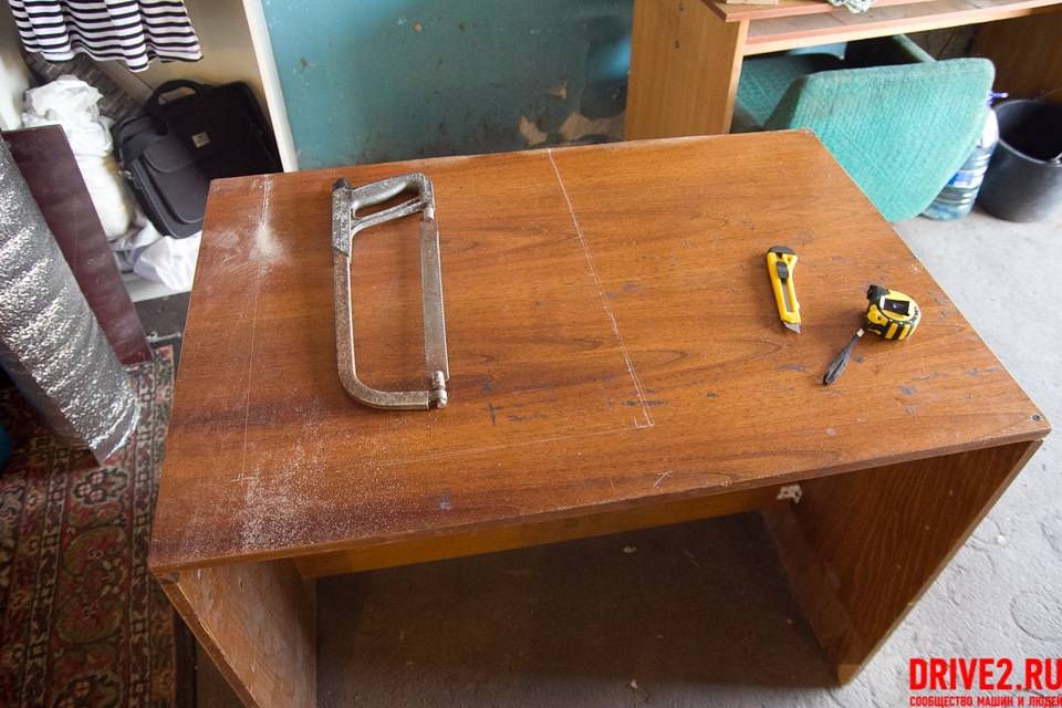 Был старый стол, за которым не мало слёз я пролил в школьное время делая домашнюю работу))) Вырезаем внём проём для раковины, дополнительно укрепил нишу стола деревянной балкой для жесткости.