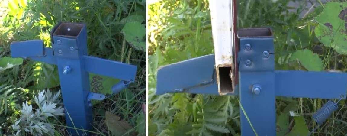 • Третий этап — прикручивание фиксатора к профтрубе. Убедившись, что труба, закопанная в грунте и залитая бетонной смесью, стоит строго вертикально, можно присоединять к ней фиксатор, который был изготовлен ранее. Это делается с помощью болта. После этого к нижней части трубы нужно приварить металлическое кольцо. Один из концов пружины, предназначенной для возвращения приспособления в исходное положение, должен цепляться за это кольцо.