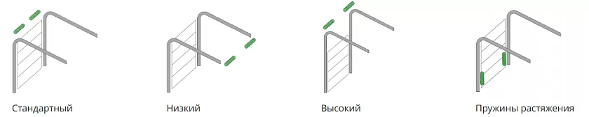 При монтаже с пружинами растяжения балансировочный механизм располагается по обеим сторонам вдоль полотна. Минимальная притолока — 100 мм для ручного и 140 мм — для автоматического управления.