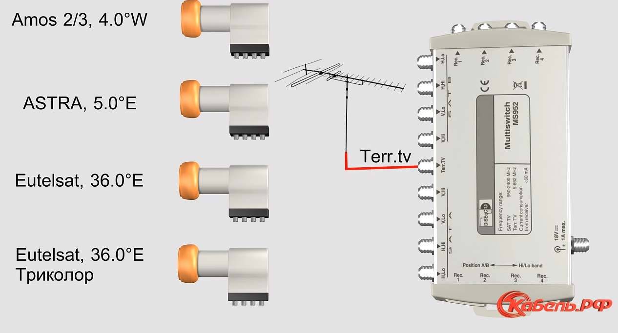 Если у вас есть еще и обычная телевизионная антенна, то мультисвитч обязан иметь вход TerrTV.
