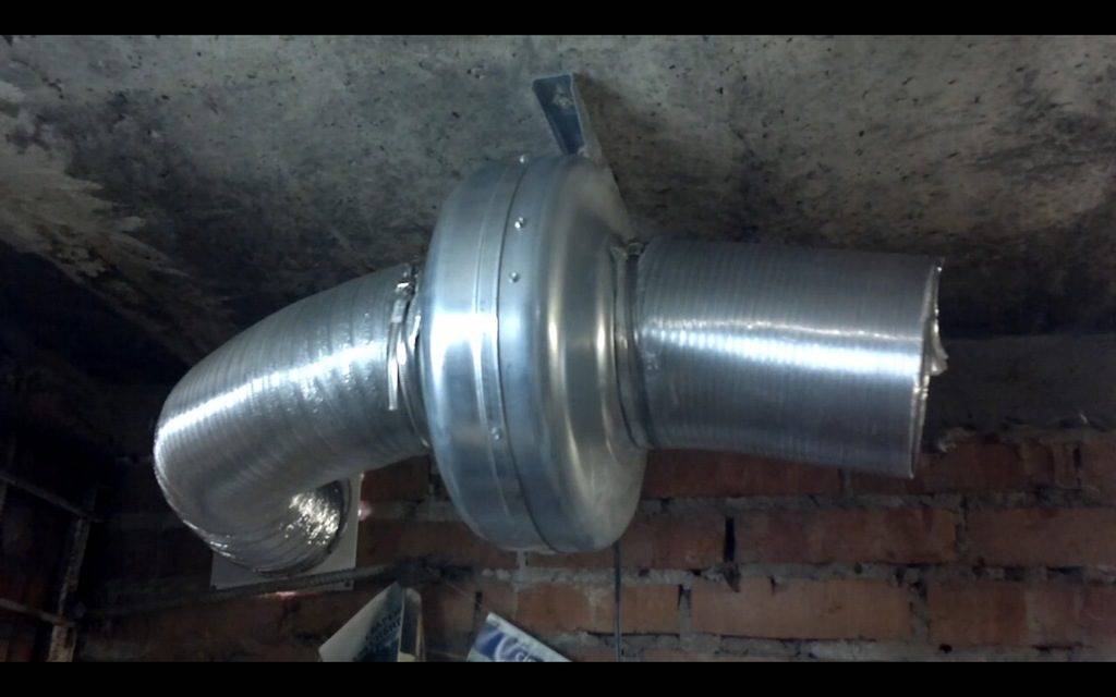 Наиболее распространенный вариант принудительной вытяжки — с двумя трубами. Первым делом пробивают в намеченных местах стен отверстия и монтируют крепежные конструкции. Далее на полу собирают сами воздуховоды. Изгибов в них избегают. В трубы помещают вентилятор, и проводят провода для их питания. Неподалеку устанавливают выключатели.