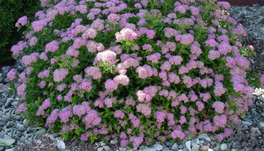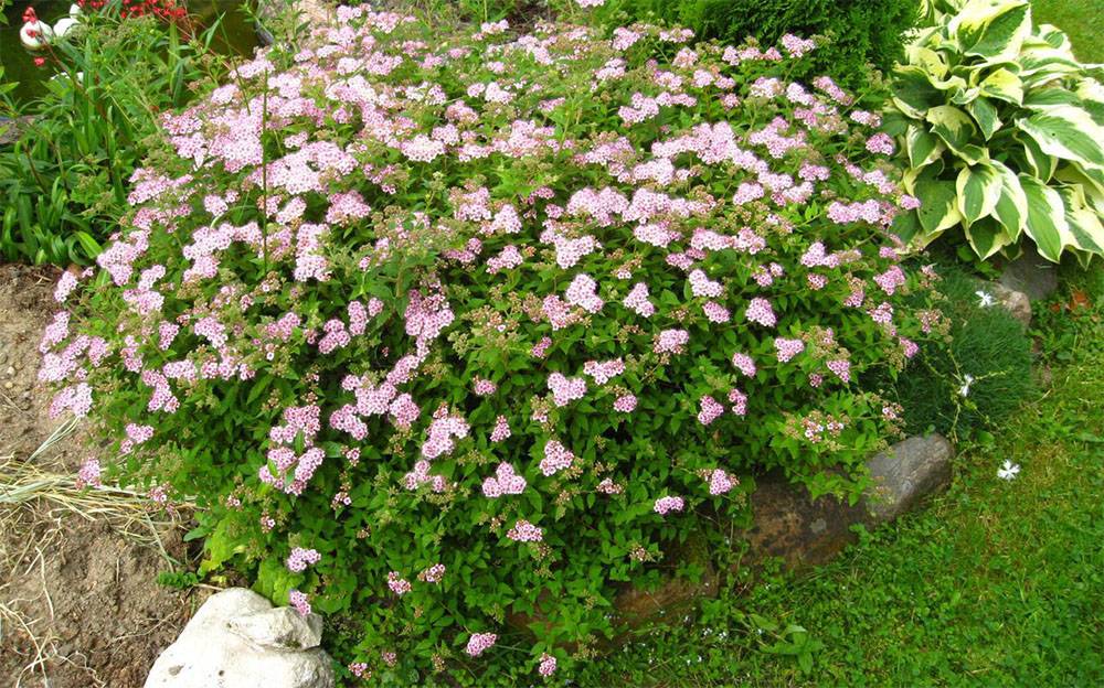 Спирея Бумальда – гибридное дитя спиреи японской и белоцветковой. Прямостоячие ребристые побеги достигают 80 см в высоту. Окраска цветков — от нежно-розового до темно-гвоздичного цвета. Период цветения – все лето.
