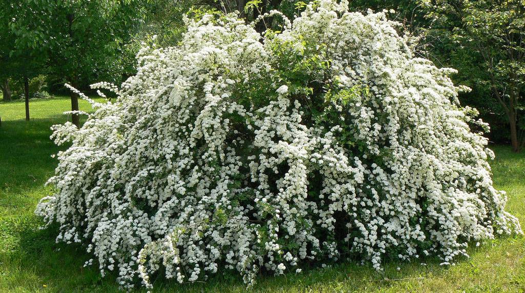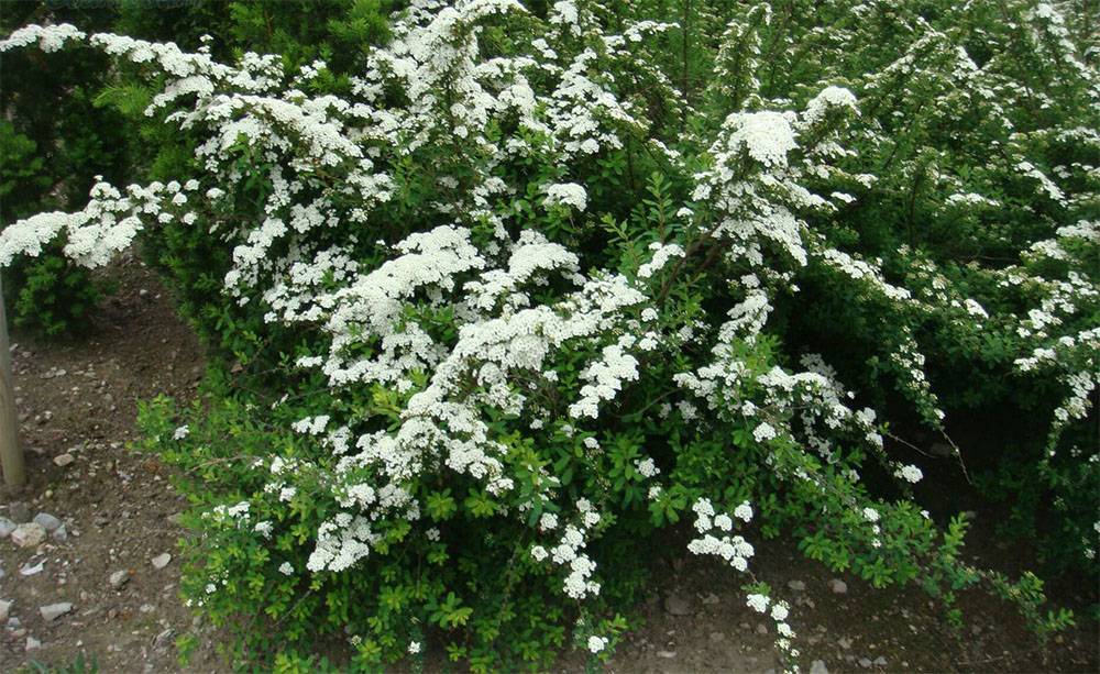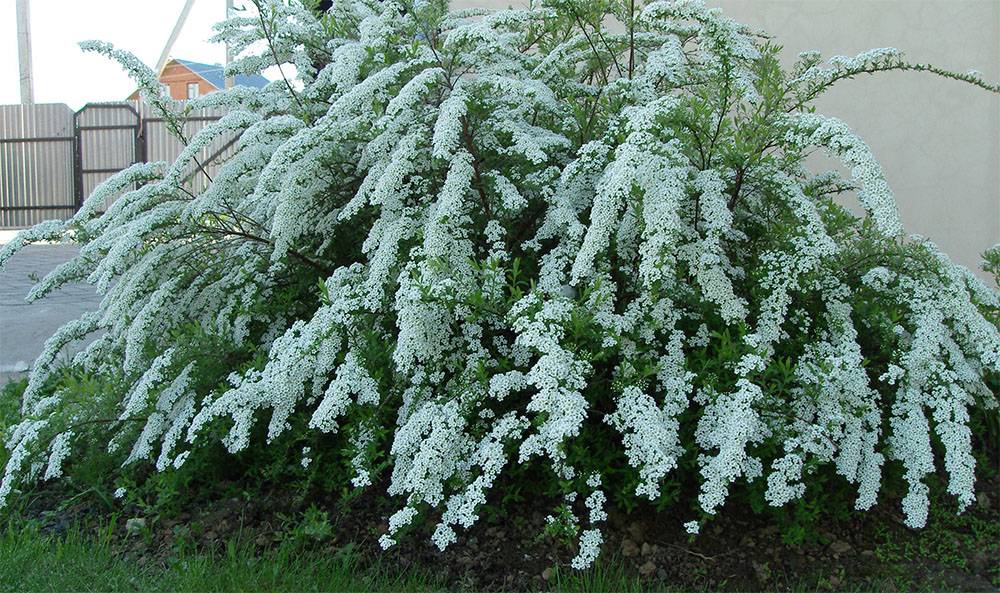 Эта спирея расцветает чуть раньше других и оттенки ее соцветий варьируются от белого до сероватого. Рослый кустарник при ближайшем рассмотрении приобретает причудливую форму за счет изогнутых побегов.