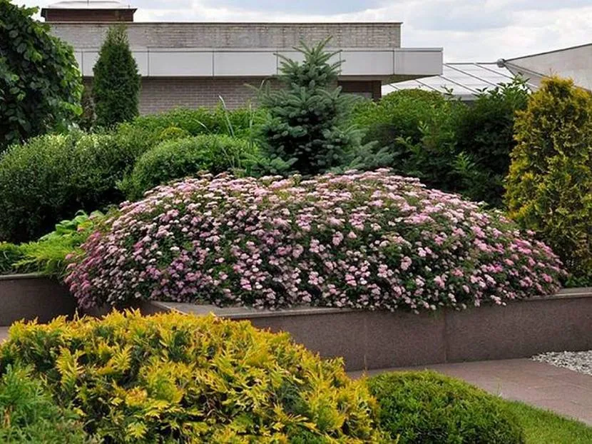 - И небольшая рекомендация по выбору соседей этого декоративного куста в ландшафтном дизайне – у них должна быть хорошо развита корневая система. Куст отлично сочетается и с низкорослыми, и с высокими растениями. Она «находит общий язык» с хвойными породами, можжевельником и туей.