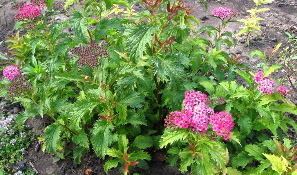 Японская – небольшой – до 1,5 метров – кустарник. Листья зеленые сверху и синеватого оттенка снизу. После начала цветения у них появляется красноватый оттенок. Цветет все лето. Окраска цветков – розовая, соцветия метельчатые. Популярные сорта – Литл Принцесс, Широбана, Голден Принцесс.