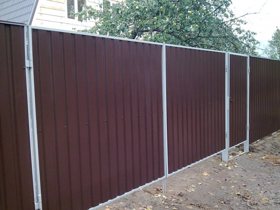 Для изгороди из профнастила будет нужно залить качественный фундамент, установить опорные столпы, вмонтировать лаги и закрепить профилированные изделия