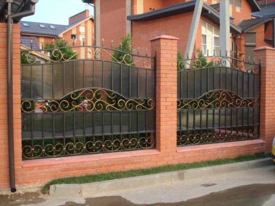 Забор из поликарбоната обычно устанавливается в обрамлении металлического каркаса или в сочетании с коваными элементами. Во втором случае решается проблема видимости того, что происходит во дворе со стороны улицы, а забор не теряет изящности и оригинальности. Достоинствами ограждений из поликарбоната являются светопроницаемость, разнообразие расцветок, защита от ветра, хорошая шумоизоляция.