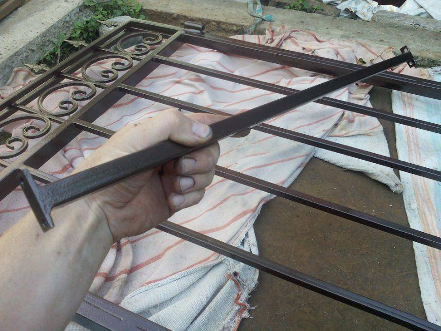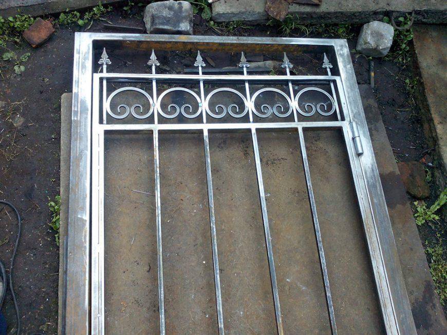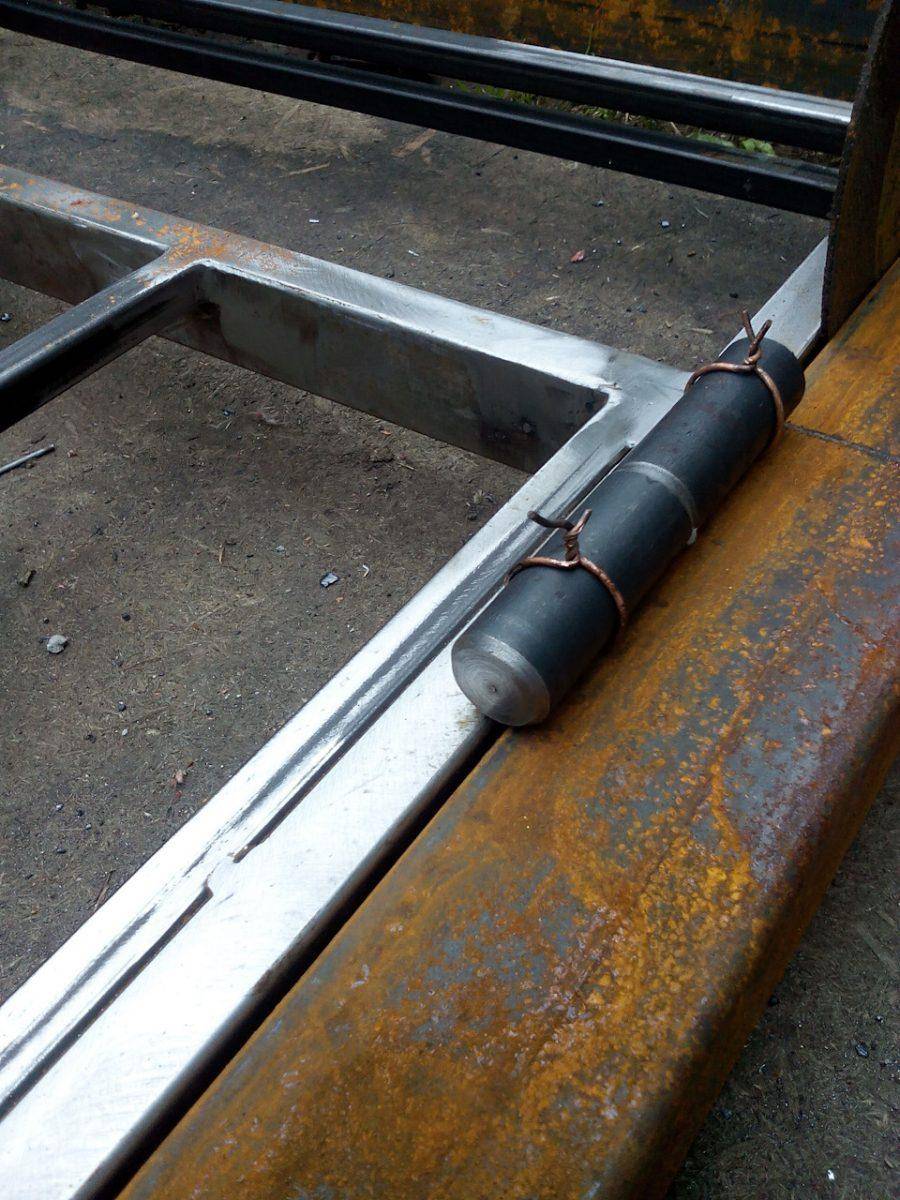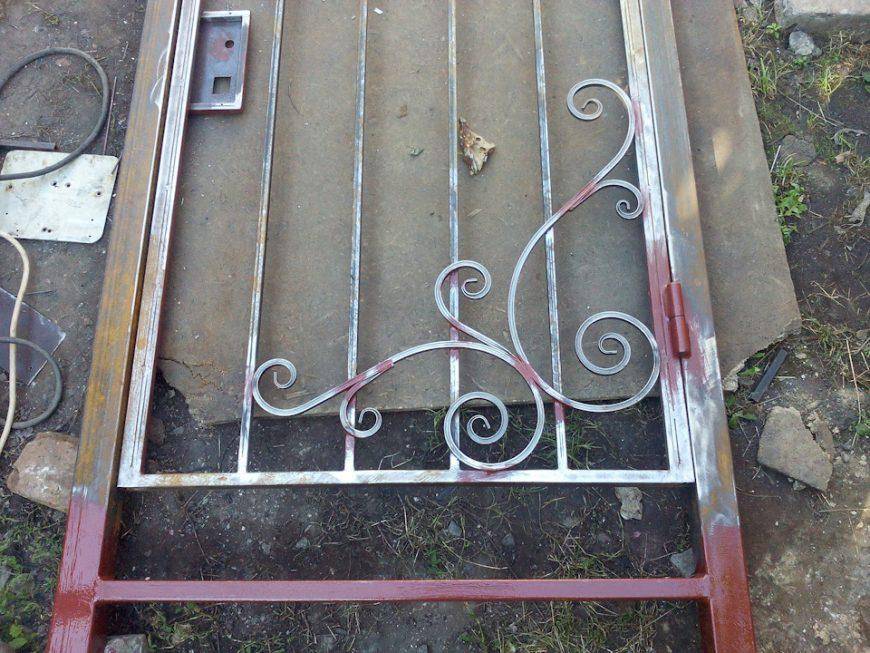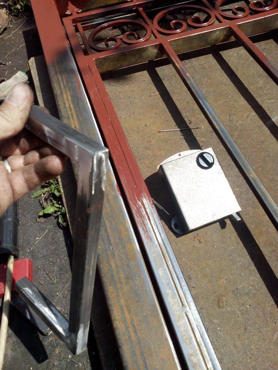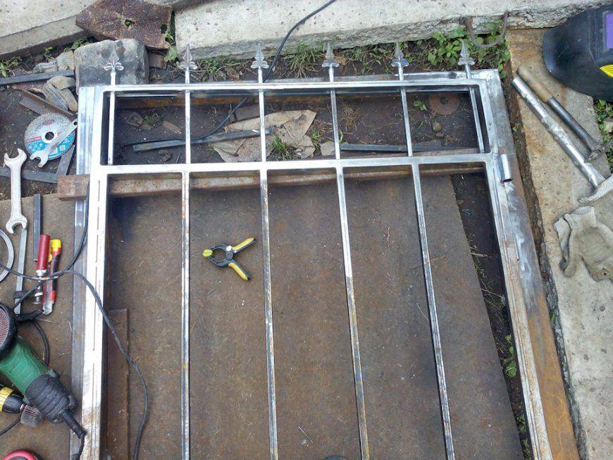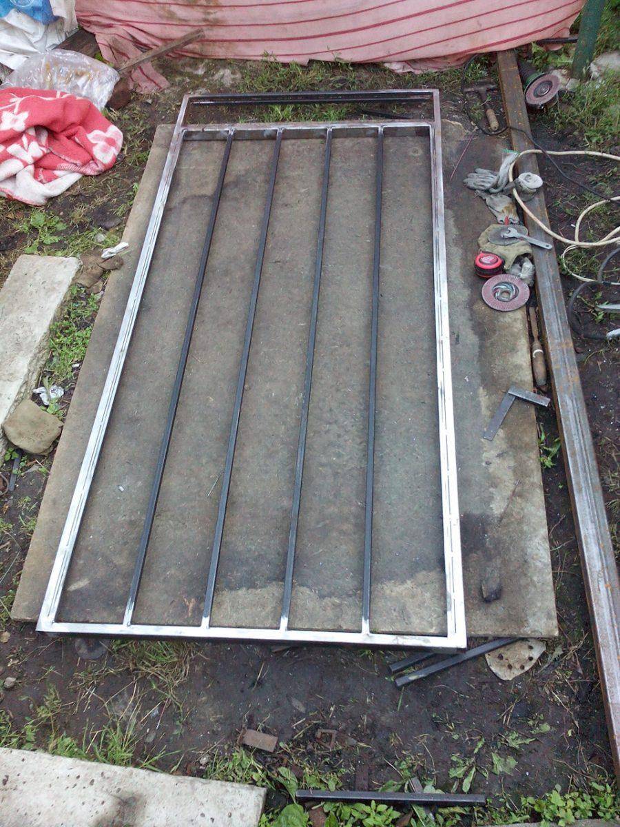 - Делается усиление калитки: берутся металлические трубы, прикладываются к каркасу, на них с помощью мела отмечаются места срезов, далее с помощью болгарки готовятся нужные элементы и привариваются.