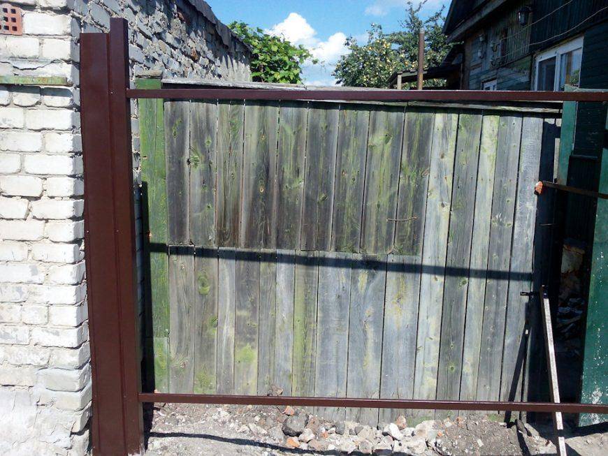 Для формирования каркаса потребуются доски толщиною 40 или 50 мм и шириною 150 мм. Лучше, если они будут сосновые. Их так же, как и в случае с профильной трубой, подрезают под ширину и высоту воротного проема.