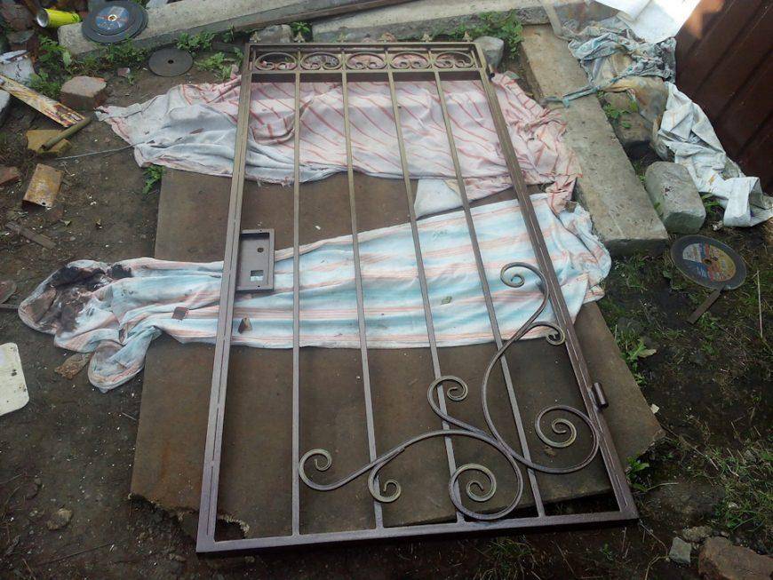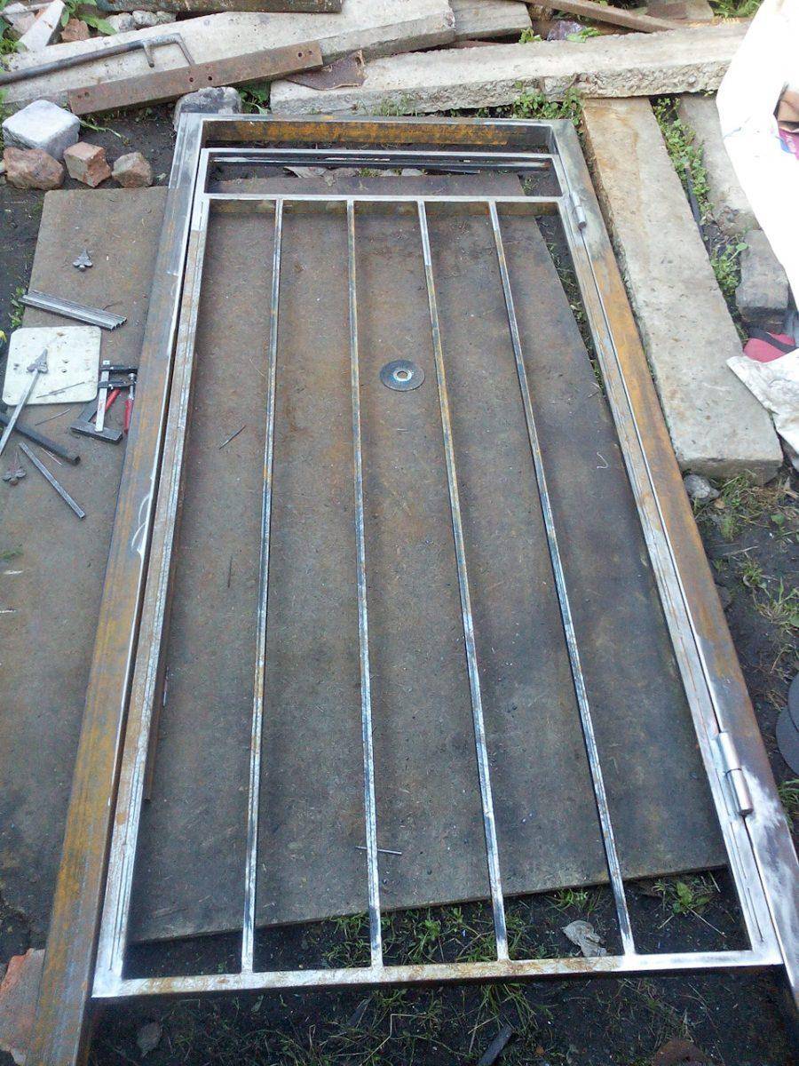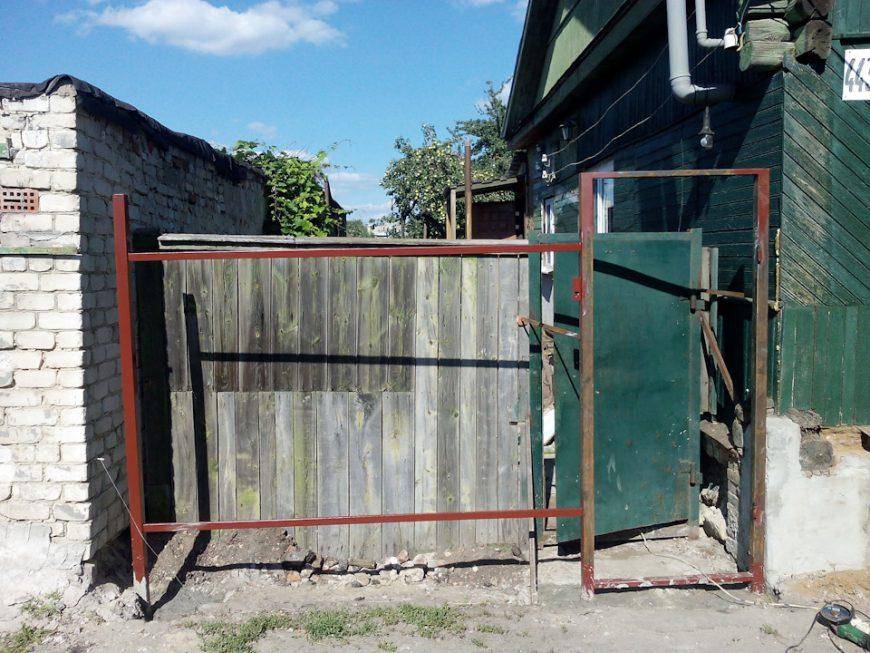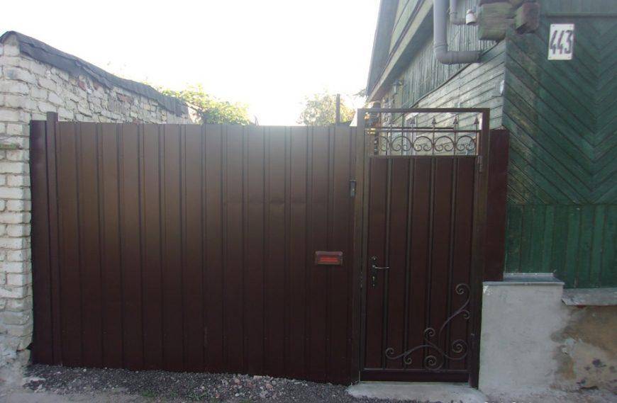 - Отрезается лист профнастила, примеряется к каркасу, проверяется, чтобы калитка хорошо открывалась. Если все хорошо, хорошенько прикручивается на саморезы.