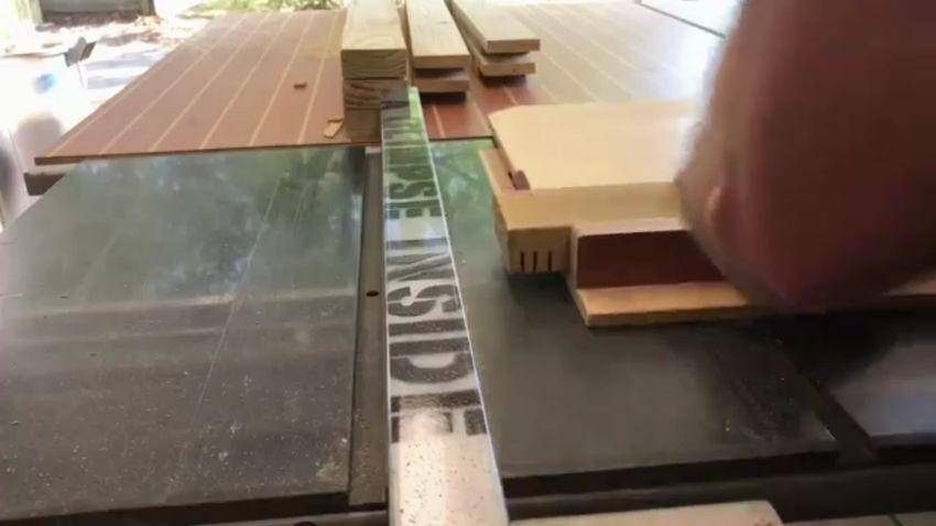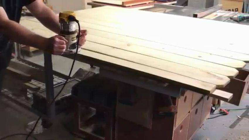 Для сборки подготавливают два одинаковых горизонтальных бруса по ширине калитки, на которые будут набиваться вертикальные рейки. Их выставляют на подготовленном столе параллельно друг другу. На столе желательно сделать разметку и прикрутить упорные панки.
