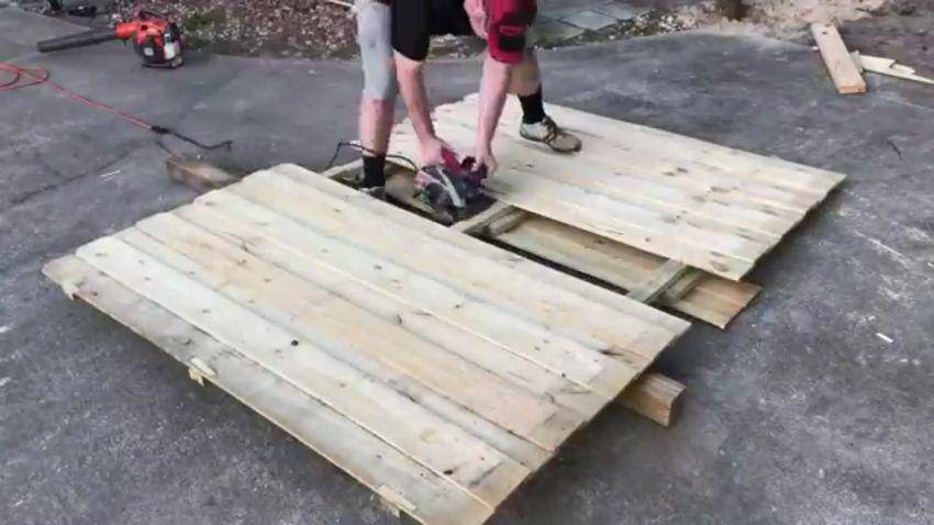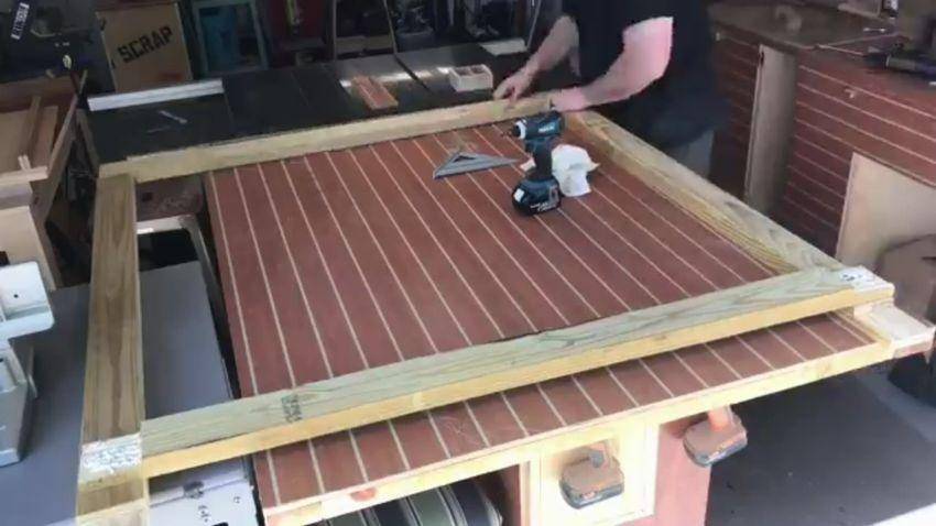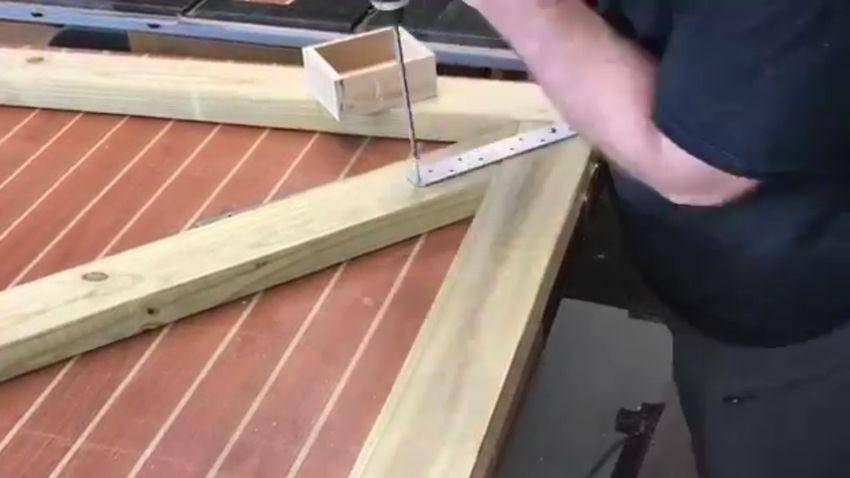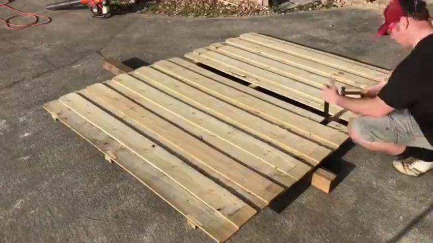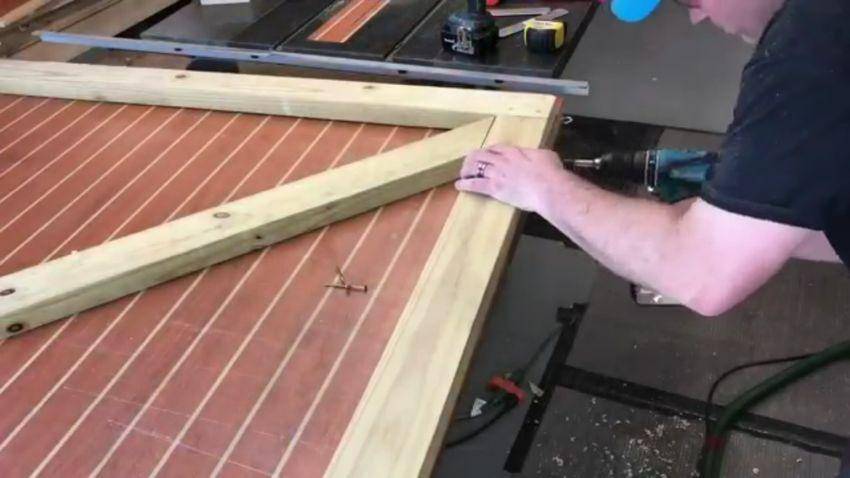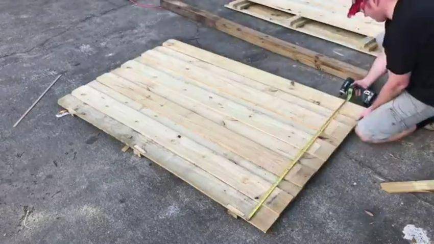 - оба каркаса укладывают на ровную поверхность и прикрепляют дощатый настил — заполнение створок;