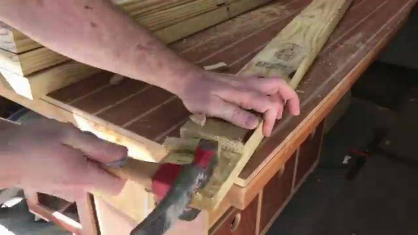 Также на ровной плоскости, или на выставленных в одной горизонтальной плоскости кирпичах или блоках их собирают в каркас. Единственное отличие – соединение и крепление. Для этого концы стыкуемых элементов придется подготовить. То есть создать соединение – в пол доски. На фото ниже этот способ показан