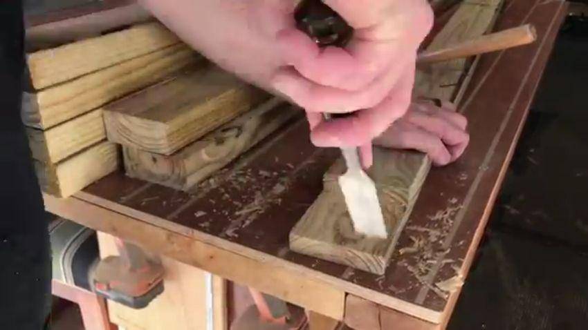 Вертикальные бруски не обязательно отрезать по длине, лишние концы можно обрезать после сборки. А поперечные необходимо отрезать по длине, так как на них будут вырезаться шипы 3 см. Если ширина боковой стойки 70 мм, то длина поперечки будет на 80 мм меньше ширины калитки (140-60мм). Шип прорезается ножовкой, щечки скалывают стамеской. Проушину в стойке высверливают при помощи дрели и дорабатывают стамеской.