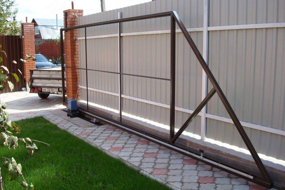 Несмотря на сложность изготовления и более высокую стоимость чаще всего выбирается конструкция сварных откатных ворот консольного типа. Их основой является балка с установленным полотном, которая сдвигается по роликам, размещенных сбоку от проема. Для установки со стороны открытия необходимо свободное место в 1,5 раза превышающее ширину створки.