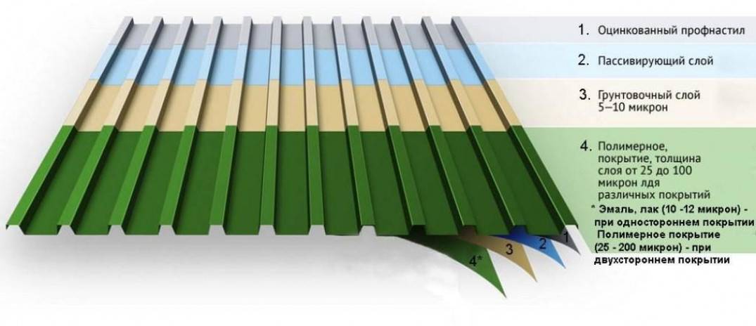 Профилированный настил часто покрывают лакокрасочным или полимерным защитным слоем, что придает ему определенный цвет.