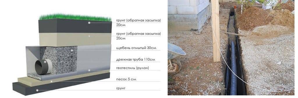 Трубы для проведения водоотводных мероприятий согласно нормативным документам могут быть из асбестоцемента, керамики или пластика. Щебень следует выбирать с размером фракции (зерен) 20-40 мм. Песок применяют тот же, что и для обратной засыпки (среднезернистый или крупнозернистый).