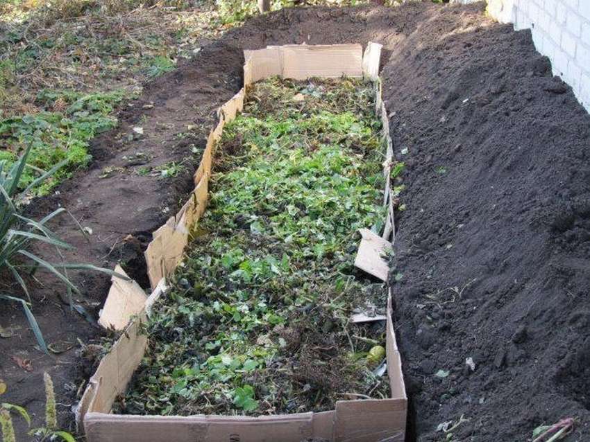 Траншея. Снимается верхний грунт и насыпается в углубление растительная начинка.