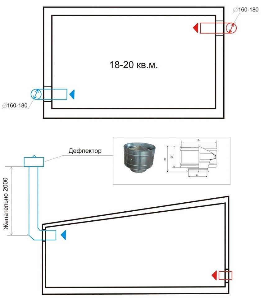 - Диаметр вытяжной трубы может быть процентов на 10% диаметра приточной.