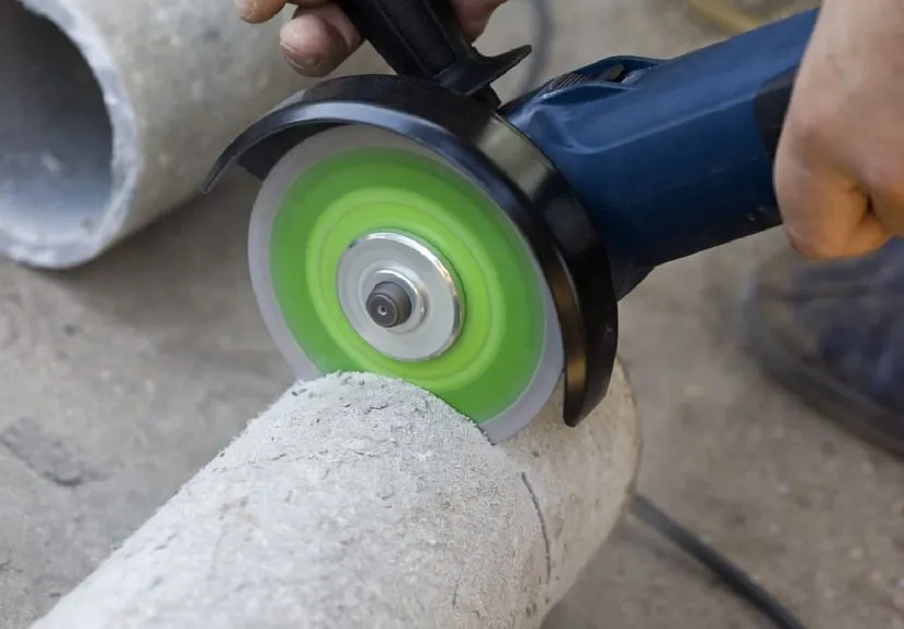 Материал легче всего разрезать болгаркой. Инструмент работает с изделиями разного диаметра и толщины стенок, а высокая скорость оборотов алмазного круга оградит от сколов и появления трещин. Если используют циркулярную пилу, то устанавливают диск с твердосплавными деталями. Один должен человек резать, а второй поливать участок среза водой. Жидкость минимизирует образование опасной пыли.
