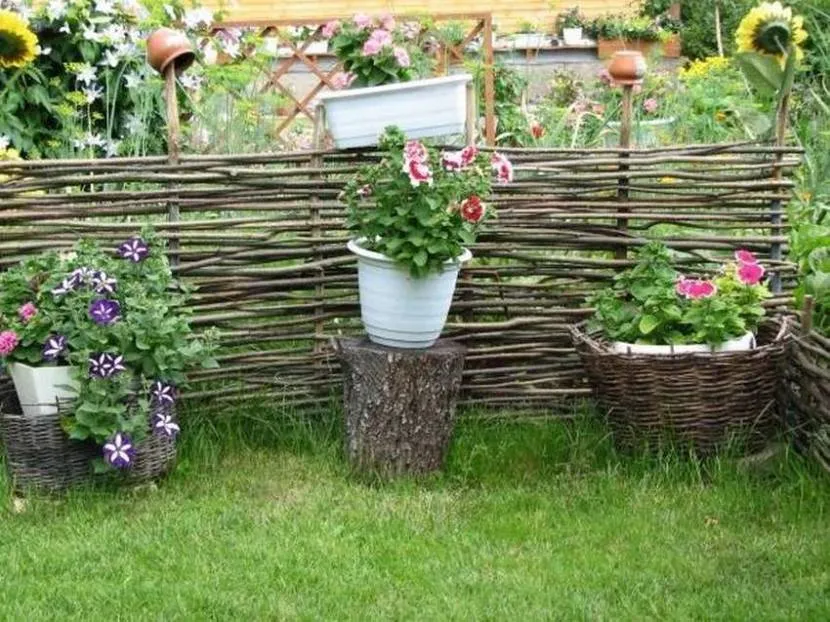 - Для цветов возможны два решения, которые используют по отдельности. Растения сажают вдоль плетня или выставляют в горшках. Если забор крепкий, на нем закрепляют плетеные корзинки с небольшими цветами (фиалками или петуньями).