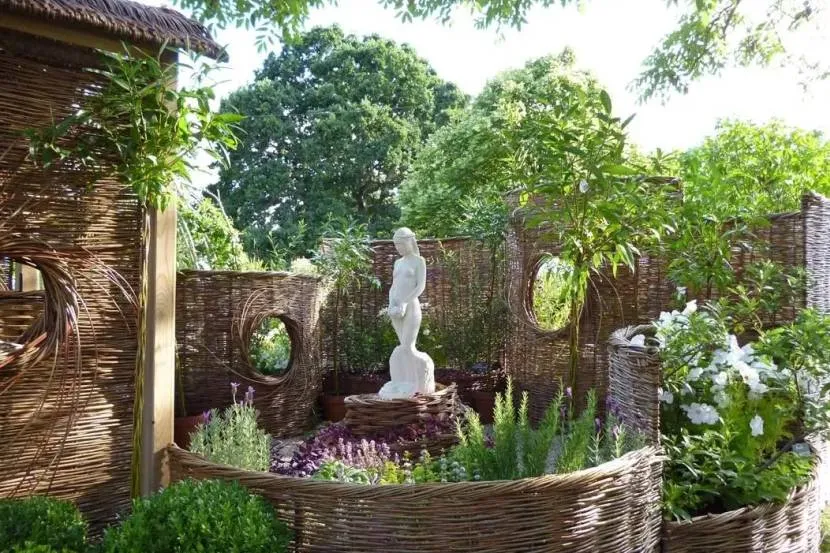 - Средние. Плетеные ограды высотой 1-1,5 м подходят для выделения на участке определенных зон, например, детской площадки или террасы около бассейна.