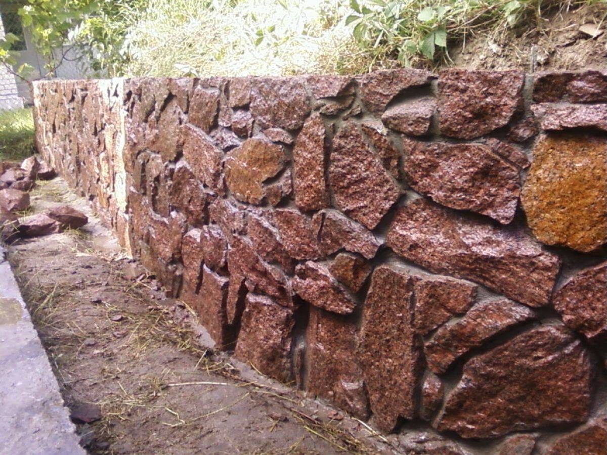 - Под лопатку. Первым слоем кладут подушку из цемента высотой 3 см. Затем – ряды камня высотой в 25 см, с заполнением щелей мелкой галькой или щебнем, а затем заливкой бетонной смесью. Камни кладут «постелью». Рваные края образуют внешние стороны стены.
