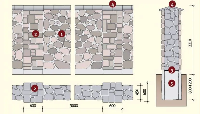Параметры каменного забора с фундаментом Источник stroyfora.ru