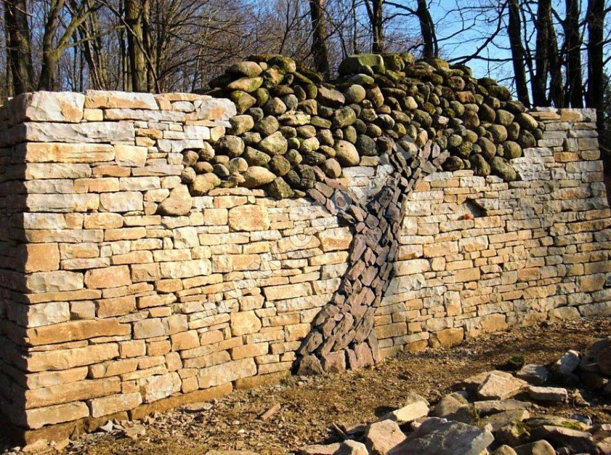 - природный камень не прошедший обработку, обладающий неровными краями и разным размером отдельных элементов, что позволяет получить ограждение с предельно естественным внешним видом;