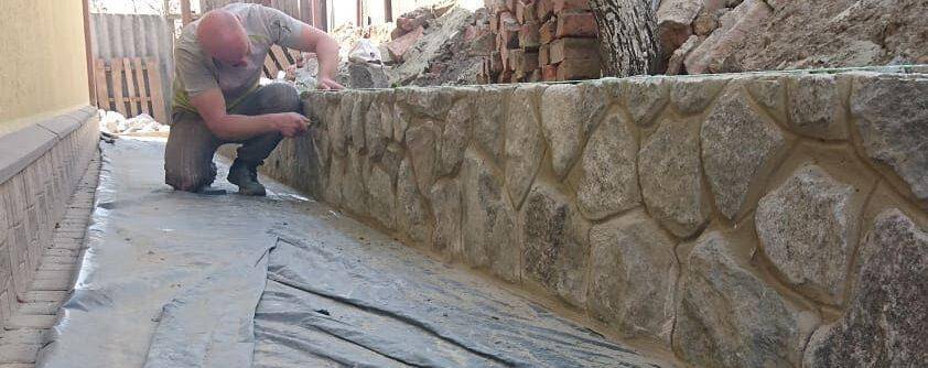 - Выберите и уложите камни для первого ряда с применением раствора. В качестве скрепления используйте приготовленный густой цемент. Легче всего выкладывать ровные камни. В случае с неровными краями камней, заливайте в зазоры дополнительное количество цементного раствора. Тем же способом выкладываются остальные ряды.