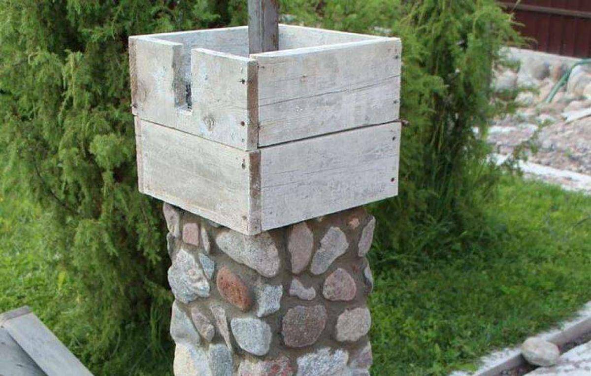 Быстро и удобно возводить столбы из натурального камня позволяет применение скользящей опалубки. Она состоит из короба, сбитого из досок, внутренние размеры которого соответствуют желаемым габаритам столба.