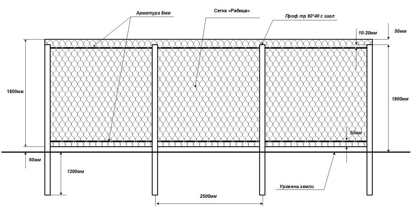 Выполняет больше роль механической преграды, чем функцию серьезного защитного сооружения. Забор из рабицы имеет самую низкую стоимость среди своих конкурентов (из металла).
