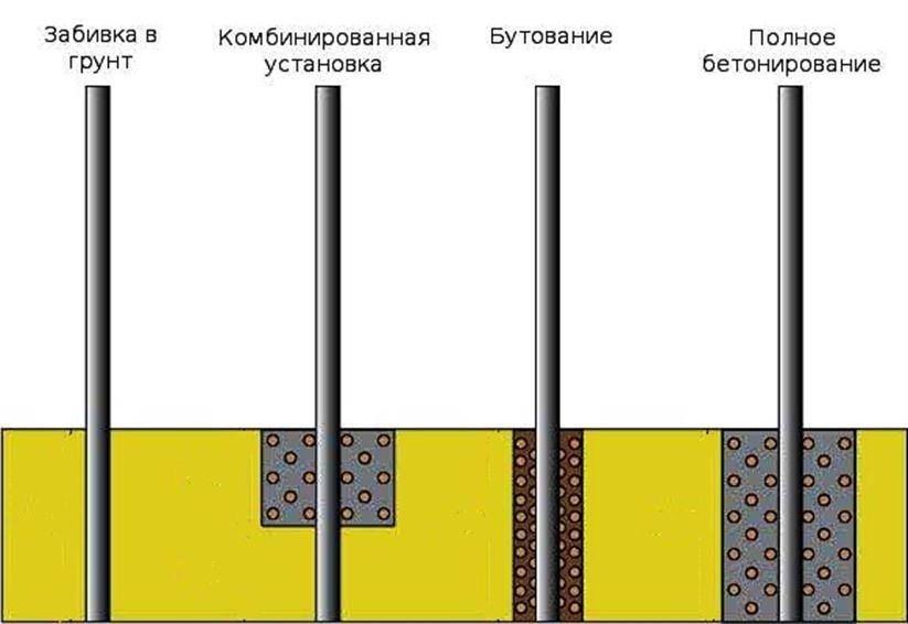 Глубина закладки подземной части столбов и ее вид определяется несущими способностями грунта. Обычно ее делают ниже уровня промерзания почвы на 20-30 см, чтобы исключить влияние пучения грунта на опору забора.