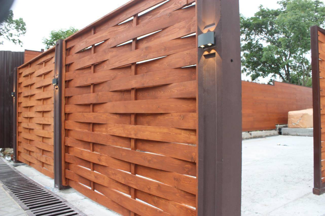 Не обязательно делать стандартный забор, вариантов очень много. Эффектно смотрятся комбинированные конструкции. Например, штакетник из лиственницы хорошо сочетается с металлическим каркасом. Если есть опыт работы с материалом, можно сделать художественные конструкции, воплотив самые смелые дизайнерские решения