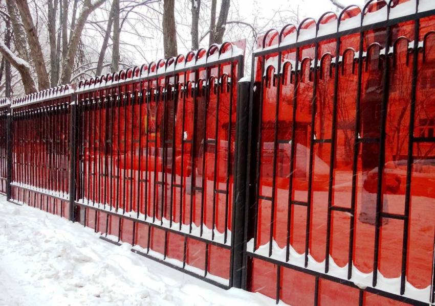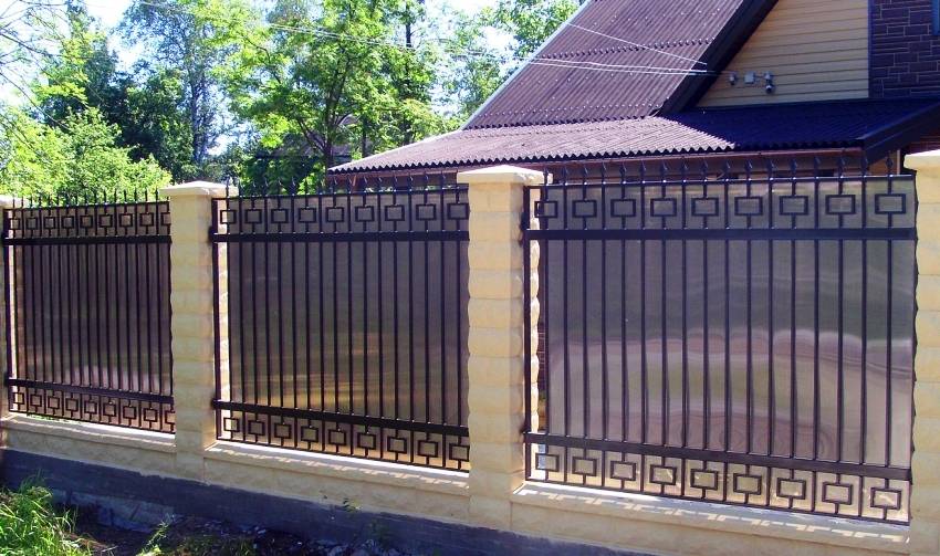 Наиболее интересный способ использования карбоната – монтаж подобного забора с ковкой. В зависимости от индивидуальных условий можно подобрать прозрачные или полупрозрачные листы поликарбоната. Специалисты советуют использовать второй вариант в сочетании с металлическими коваными прутьями. Существует возможность монтажа ПКБ позади секций (с внутренней стороны).