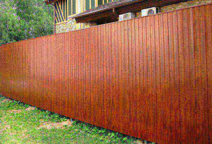 Заборы из профилированных листов не нуждаются в особом уходе, могут прослужить не один десяток лет. Безусловно, внешняя кладка из натурального материала будет иметь более выигрышный вид, по сравнению с коричневыми, зелеными или бордовыми листами. Но себестоимость такого ограждения очень высокая. Поэтому правильным выбором станут профилированные листы под дерево, они дешевле, имеют отличное качество.