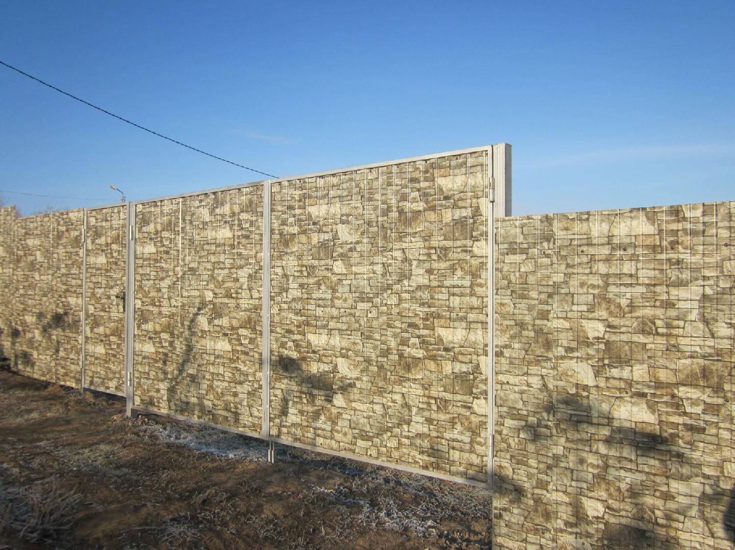 - Для строительства заборов. Благодаря нанесению качественного принта, имитация камня настолько полная, что его легко можно спутать с забором из натурального материала. Особенно сложно отличить такое изделие, если изготовить опорные столбы из кирпича и обложить их песчаником