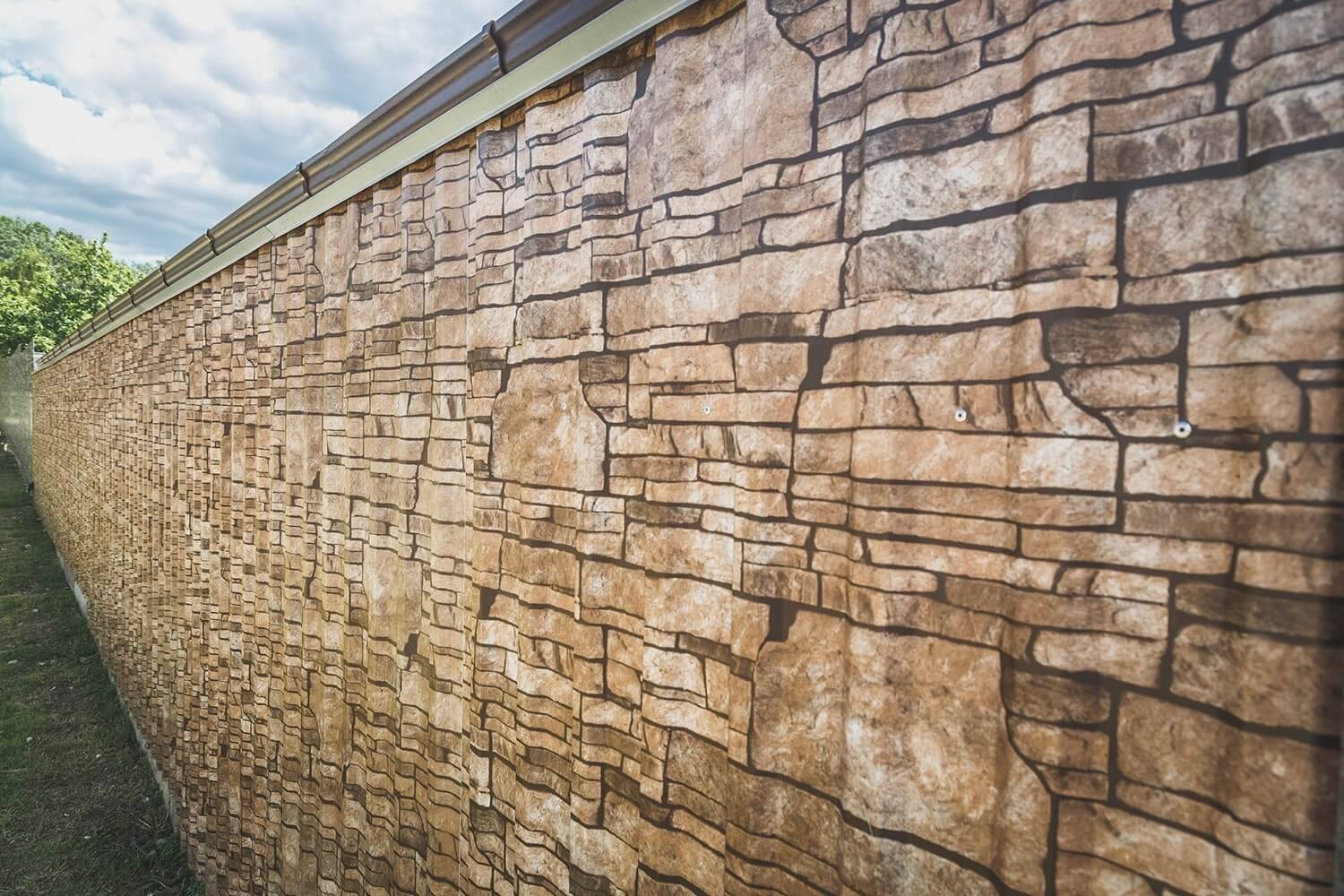 Профнастил с рисунком под камень достоверно имитирует каменную стену. При этом, это не условный декор, листы детально похожи на дикий камень, гранит, песчаник и другие виды.