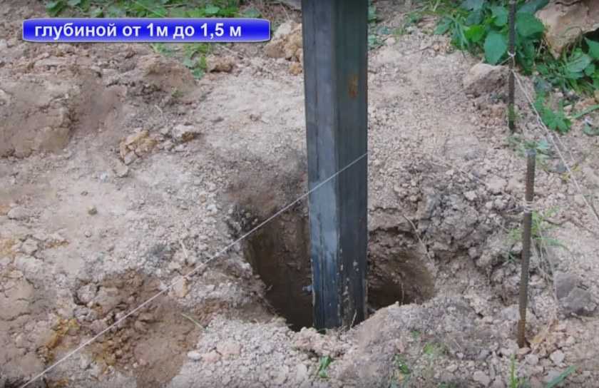 Обычно для них используется металлические трубы квадратного (от 60*60 мм) и круглого сечения (от 75 мм). Обращенные вверх отверстия труб заваривают, чтобы в них не попадала влага. Под столбы при помощи ручного земляного бура роют ямы глубиной 1-1,5 м и шириной порядка 150 мм. Чем выше будет забор, тем глубже должны быть ямы – опору следует заглублять примерно на треть высоты забора. Так как заборы из профнастила глухие, ветровая нагрузка на них высока, поэтому их фундаменты должны быть качественными и прочными.