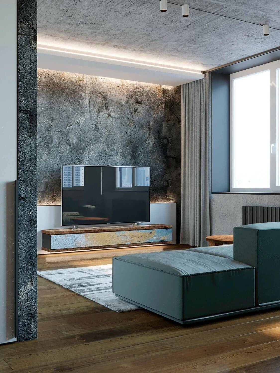 Бетонный потолок — яркий элемент гостиной. Проект кухни-гостиной «Мосфильм», дизайнер Павел Алексеев