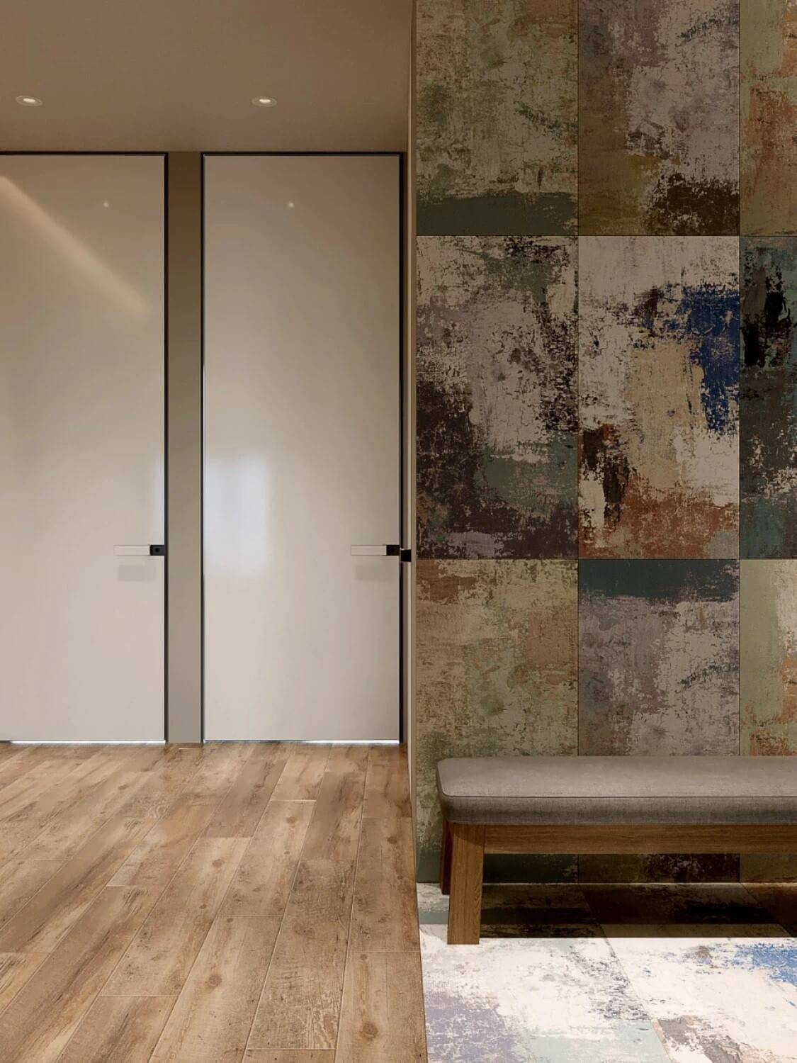 Деревянные полы интересно сочетаются и с плиткой, и с бетоном. Проект квартиры в ЖК «Хедлайнер», дизайнер Павел Алексеев
