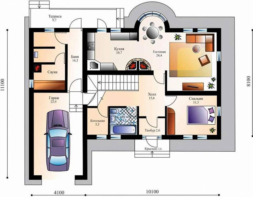 План первого этажа. Здесь размещаются технологические помещения и комнаты для приема гостей. Спальни вынесены в мансардный этаж.Источник psk-remont.ru