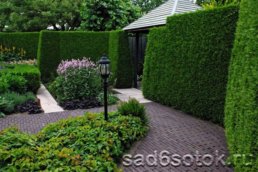 - оформление. Низкая изгородь (60–100 см) красиво обрамляет клумбы, ее высаживают вдоль тротуаров и садовых тропинок. В идеале это медленнорастущие культуры с мелкими листьями;